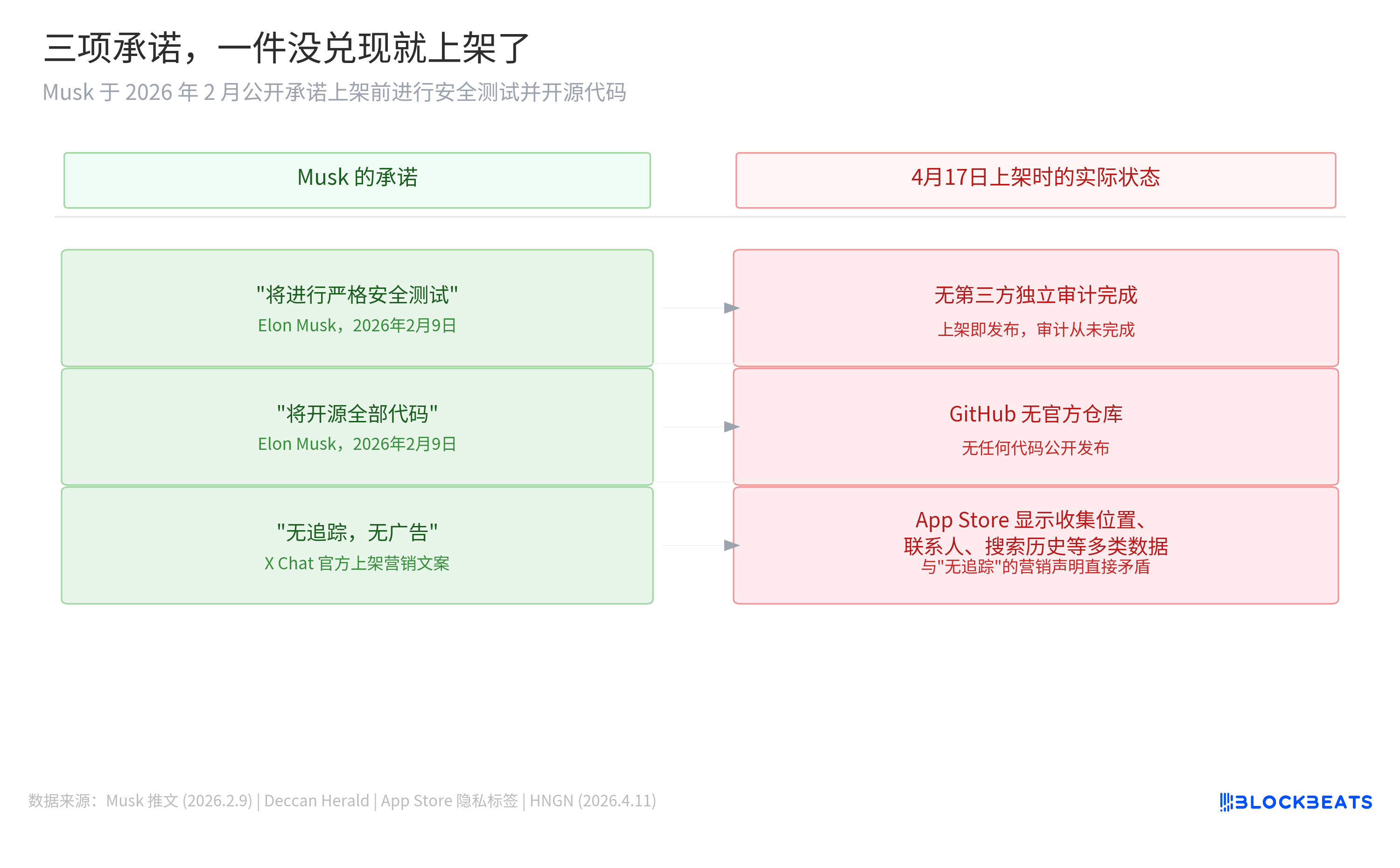 マスクは2026年2月9日にツイートし、X Chatの展開前に厳格なセキュリティテスト(「rigorous security tests of X Chat」)を行い、すべてのコードをオープンソース化すると約束しました(「open source all the code」)。