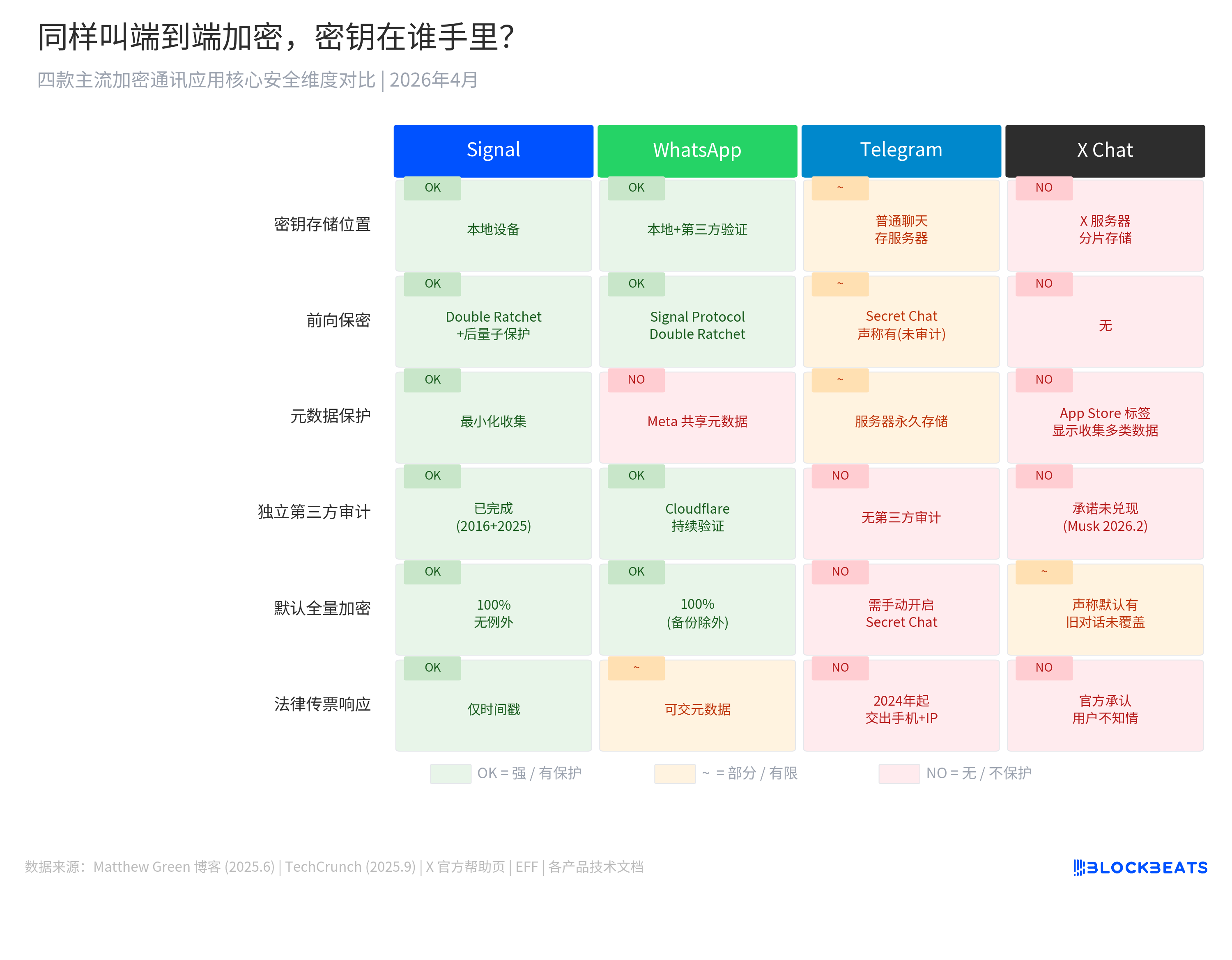 下の図は、Signal、WhatsApp、Telegram、X Chatの6つのセキュリティ機構を比較しています。X Chatはプラットフォーム側が鍵を保持している唯一のものであり、さらにフォワードセクレシー(Forward Secrecy)を持っていません。