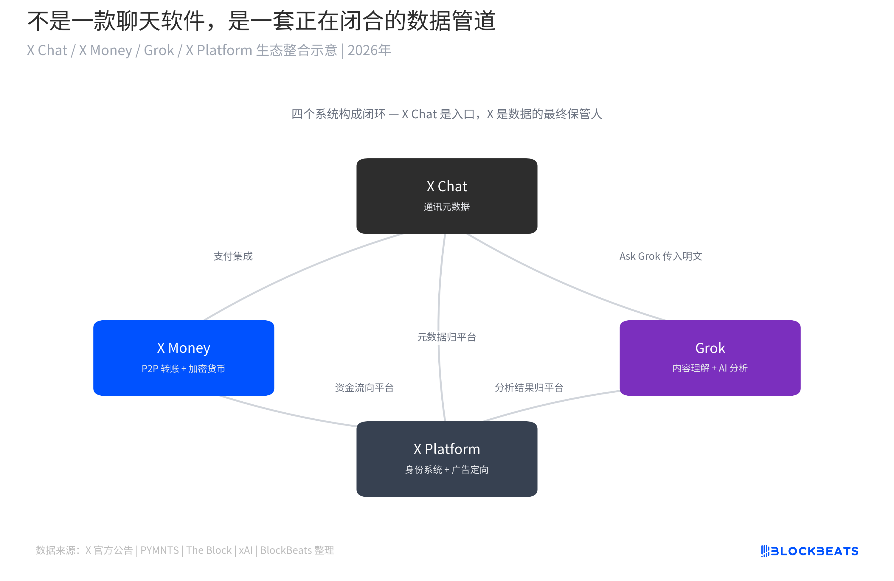 X Chatはコミュニケーションのメタデータを生成し、誰が誰とチャットしているか、チャットの頻度や期間などが含まれます。これらのデータはXプラットフォームのアイデンティティシステムにフィードされます。メッセージの一部はAsk Grok機能を介してGrokの処理チェーンに送られます。資金の流れはX Moneyが処理します:3月に外部パブリックベータテストを完了し、4月に一般公開され、Visa Directを使用して法定通貨のピアツーピア送金を実現し、Fireblocksの幹部は暗号通貨決済が年末に導入される予定であることを確認しました。現時点では、米国の40以上の州の通貨送金ライセンスを保有しています。
